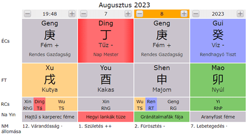 2023. 8. 7. 20:23 perckor indult el a kínai asztrológia szerint az augusztus, ami tart 2023.09. 07. 23:26 percig. Ez Yang Fém, Majom hónap, ami nem fedi le a nyugati asztrológiai oroszán időszakot. Ez a képlet adott időpillanatra van felállítva. Ez általános jellemzés, pontosan neked milyen feladatot, lehetőséget és esetleg kihívást tartogat az időszak egyéni elemzéssel vizsgálható meg.